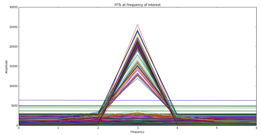 We require only one frequency information so we will be rejecting every other values and concentrating on the value which is being sent from the phone. The below plot will show us the FFT which is plotted for one particular region of the whole spectrum and everything else will be rejected
