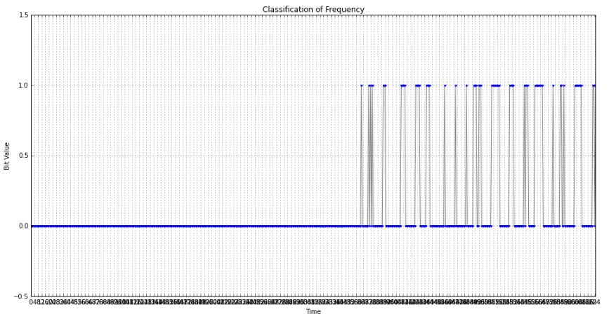 Once we get this plot then we will look for our desired frequency range where the signal was sent and suitable filters will be applied to remove and normalize the input serial information into more generalized processable format which can be co-related with bit values which are being sent as shown below